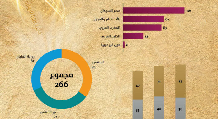 ولأول مرة في تاريخ المسابقة حصدت الاناث اعلى نسب مشاركة في فئات الجائزة الثلاث، حيث وصلت مشاركتهن في فئة الروايات المنشورة الى 55 مشاركة مقابل 38 مشاركة للذكور، وفي فئة الروايات غير المنشورة وصلت عدد مشاركات الاناث